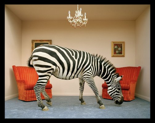 Matthias Clamer, Zebra in Living Room Smelling Rug, Side View, Photographic Print, 2022 for sale at Pamono